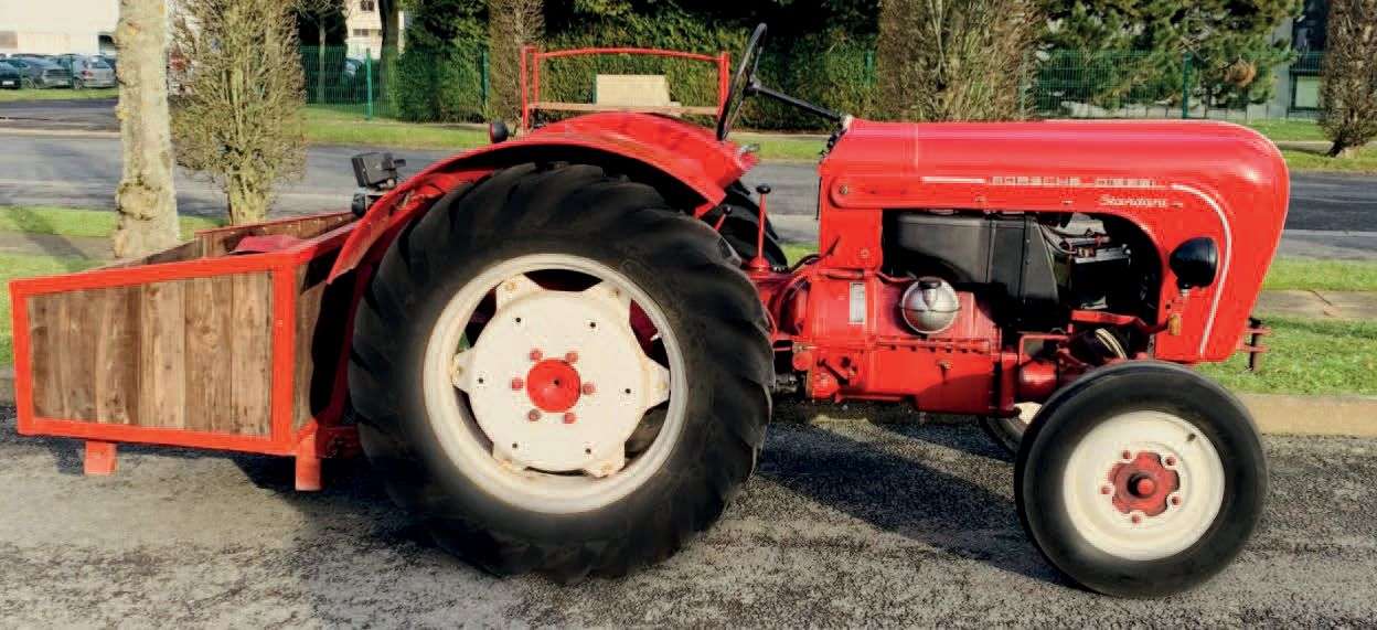Le Porsche-Diesel Standard 218, également connue sous le nom de N 218, est la troisième génération de la série de tracteurs Standard à deux cylindres , fabriquée par Porsche-Diesel Motorenbau GmbH à Friedrichshafen am Bodensee. Le Standard 218 a été produit en quatre variantes différentes et succède au type 208 dès 1957. Au total, l’usine Porsche a produit un peu plus de 12 000 tracteurs Standard 218 jusqu’en 1963. Il est considéré que celui qui imposa la marque sur ce segment grâce à son coût mesuré, sa fiabilité et sa facilité d’utilisation. Equipé du bicylindre refroidi par air de 1 644 cm3 développant 28 ch, l’exemplaire que nous présentons à la vente affiche un peu plus de 5 300 heures d’utilisation. De couleur rouge si caractéristique de ce modèle, celui-ci est complet avec son tableau de bord en aluminium guilloché, son système d’éclairage et son assise supplémentaire installée sur l’aile arrière gauche. Particularité de notre exemplaire, il est équipé d’un système d’attelage trois points optionnel que l’on retrouve rarement sur ce modèle. Très utile, ce tracteur trouvera sa place dans toutes bonnes résidences secondaires à la campagne ou dans une collection. Equipé d’une benne en bois installée sur ce système de levage, il ne fait aucun doute qu’il rendra de nombreux service avec une conception très chic des travaux extérieurs ! Immatriculé pour la première fois le 12 janvier 1959, sa restauration est ancienne mais de bonne facture, tout comme son fonctionnement, prêt à l’usage !