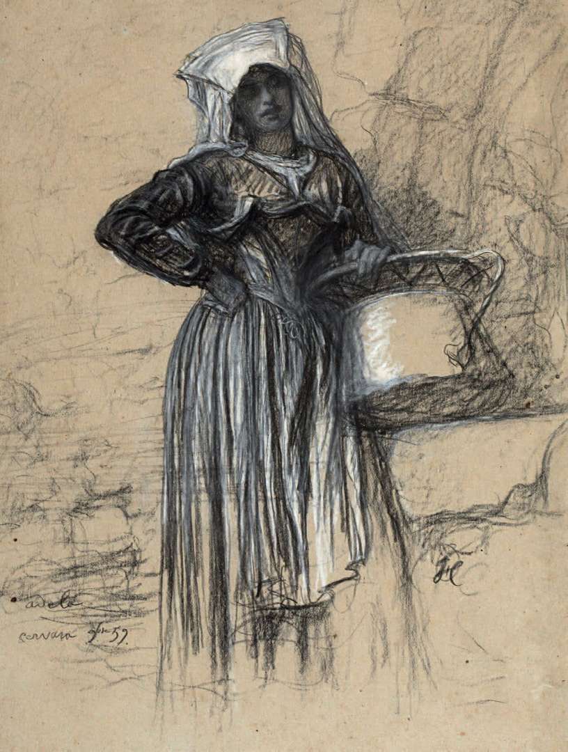 A Cervara, Hébert réalise une composition similaire à celle-ci, exposée au Salon de 1859. Cette fois, la critique reproche la redondance du style. Notre dessin n'a pas été repris dans le tableau, mais il est un exemple de la dignité que le peintre conférait à ses modèles, femmes pauvres, regardant le spectateur en léger surplomb. Certainement réalisée sur place, Hébert ne signe la feuille qu'à son retour à Paris.