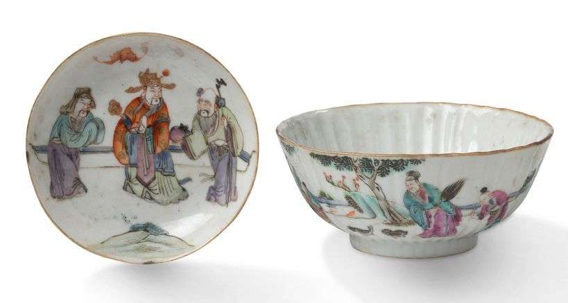 Ensemble en porcelaine émaillée polychrome comprenant quatorze pièces, dont six coupes couvertes à décor divers dépareillés, deux théières dont l'une couverte (l'autre au couvercle manquant), deux sujets en porcelaine et émaux polychromes, trois bols et une coupe.