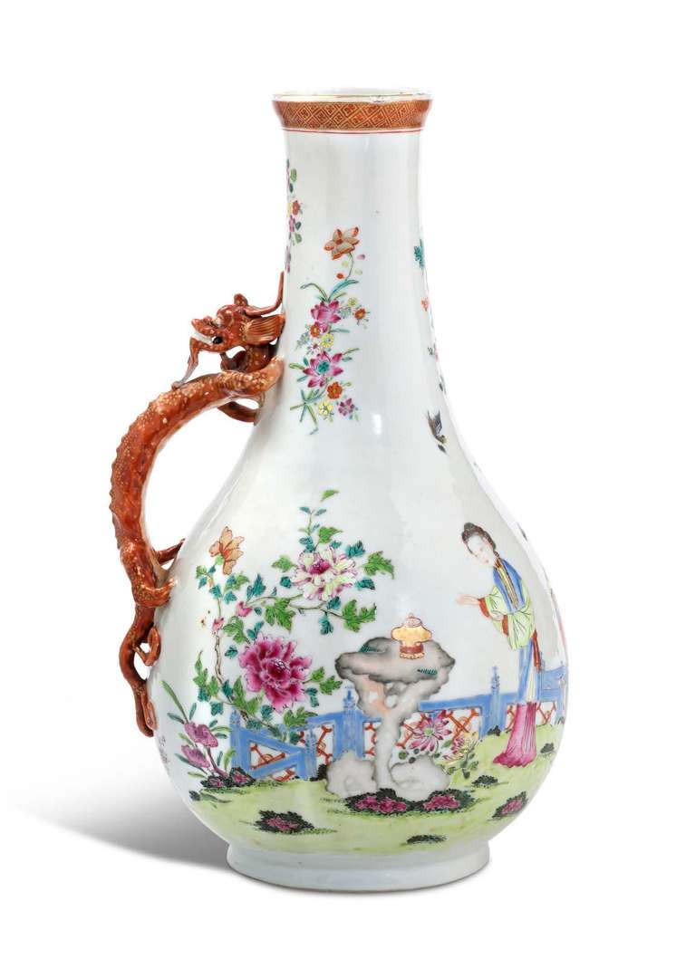 Vase bouteille avec anse en forme de dragon émaillé corail, le décor en émaux de la famille rose, représentant deux jeunes femmes devant un brûle-parfum accompagnées d'un jeune homme.
