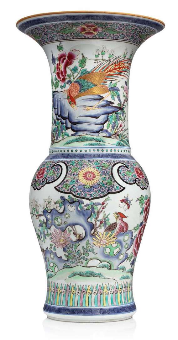 Vase en porcelaine et émaux famille rose, à décor de chrysanthèmes et faisans parmi fleurs et rochers.