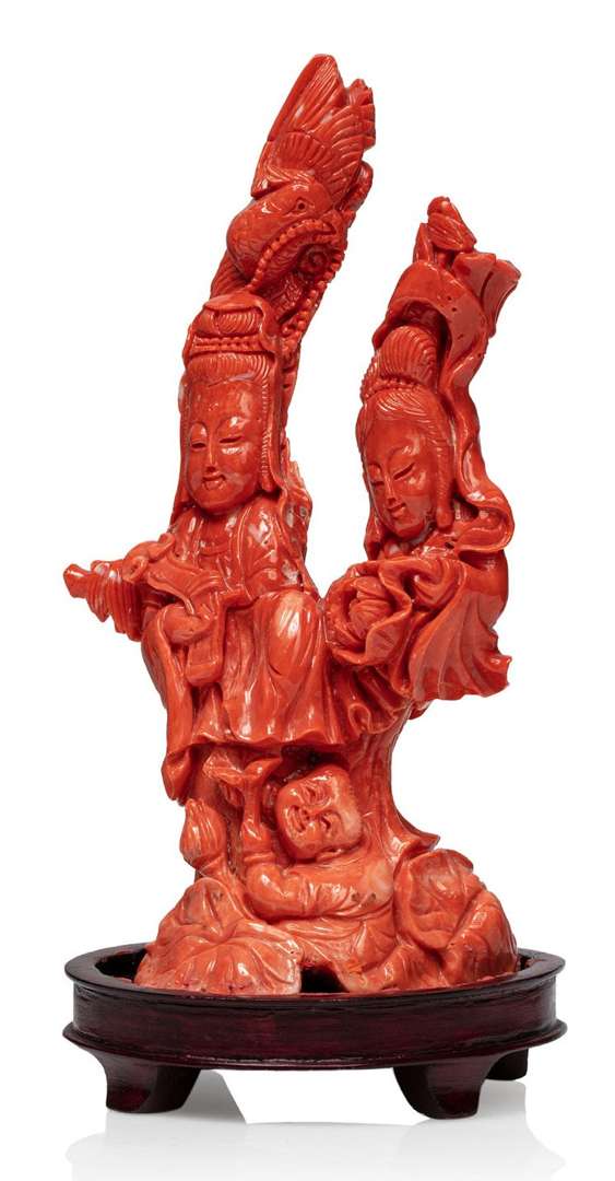 Sujet en corail rouge orangé, représentant deux divinités surmontées d'un phénix, l'une tenant un sceptre. L'autre, une fleur de pivoine, à leur pieds un enfant présentant une fleur de lotus.