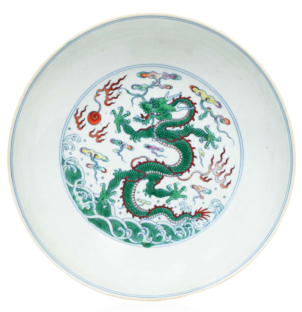 Coupe en porcelaine et émaux doucai, à décor en médaillon central d'un dragon à cinq griffes au-dessus de vagues écumantes, poursuivant le joyau sacré, parmi des nuages reprenant la forme de ruyi. Marque Yongzheng en kaishu et d'époque.