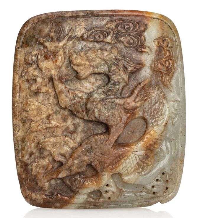 Boucle de ceinture en jade céladon infusé de rouille, à décor d'un dragon poursuivant la perle sacrée parmi des nuages.