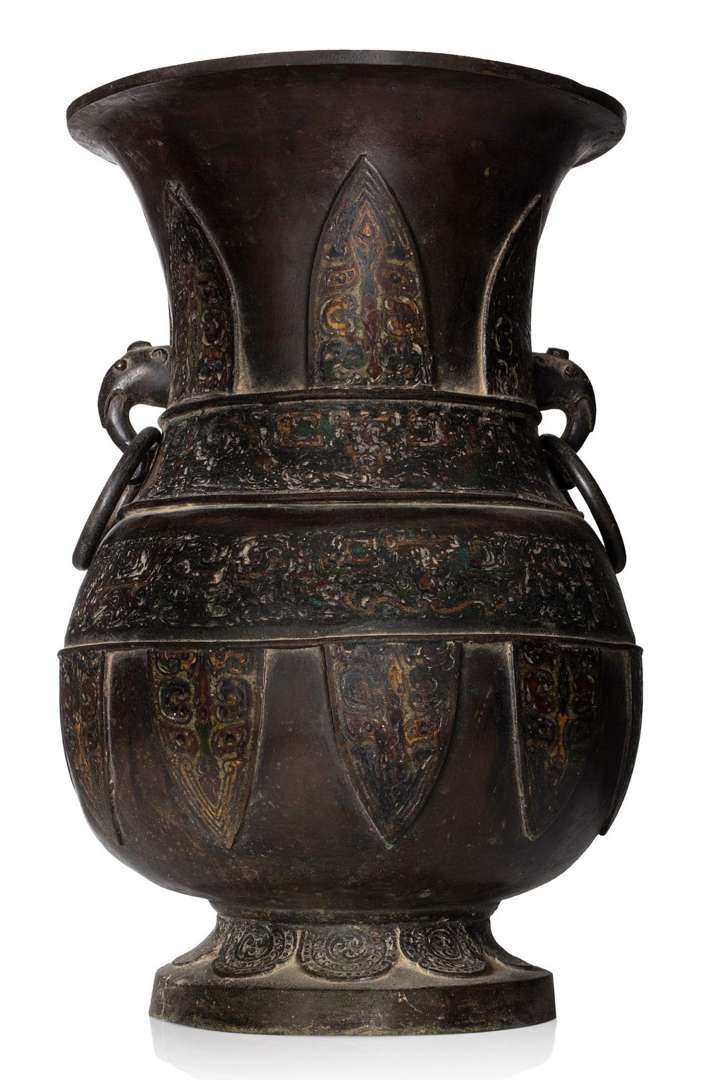 Vase balustre à col évasé en bronze à décor archaïsant en émaux cloisonnés polychromes. Anses figurant des têtes d'éléphants.