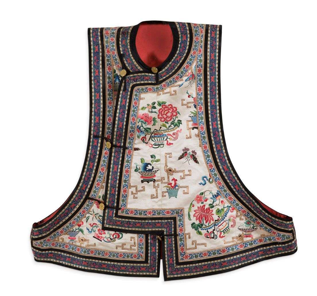 Surveste de femme sans manches, en soie crème brodée aux fils dorés et polychromes de papillons, vases fleuris, dragons stylisés en motifs géométriques, les bords soulignés de deux bandeaux brodés de motifs stylisés sur fond bleu et fond blanc, et gansés de noir. Doublé de soie corail.