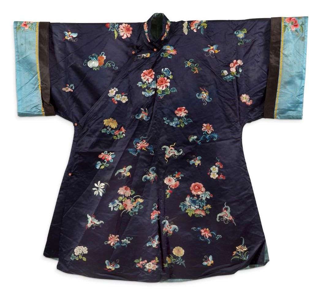 Robe en satin de soie bleu nuit, brodée aux fils polychromes de papillons et bouquets de fleurs, les manches bordées de soie bleu clair à décor de papillons et fleurs. Doublée de soie damassée bleue. (Manches retournées)
