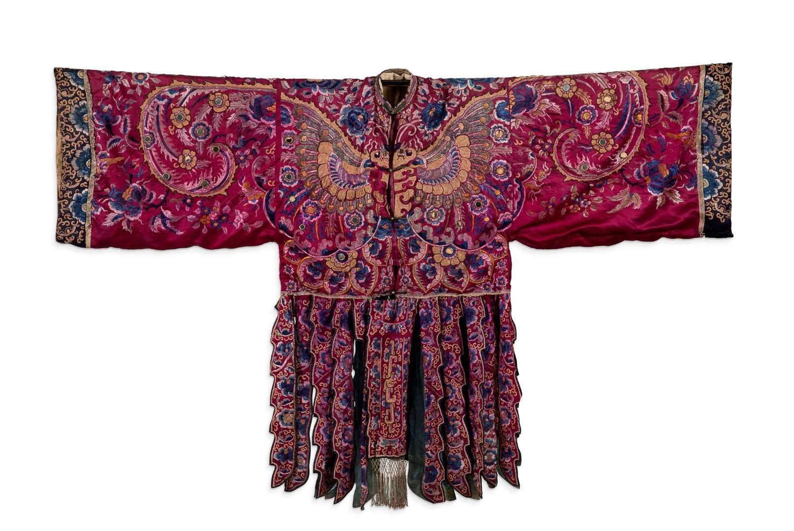 Robe d'opéra en soie pourpre, à décor brodé aux fils polychromes et rehaussé de petits miroirs, représentant deux grands papillons parmi des motifs floraux, la jupe formée de plusieurs pans brodés de fleurs, évoquant les queues des papillons. Doublée de lin beige.