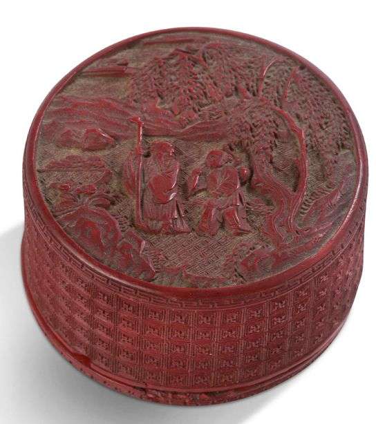 Petite boîte circulaire couverte en laque de cinabre, finement sculptée d'un philosophe accompagné de son disciple traversant un paysage rocheux près d'un érable. Le pourtour et la base ornés de swastika.