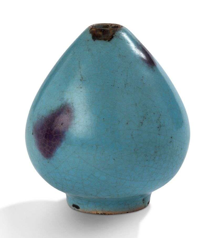 Petit godet de type Junyao, reprenant la forme d'un bouton de lotus, émaillé bleu lavande, partiellement parsemé de pourpre.