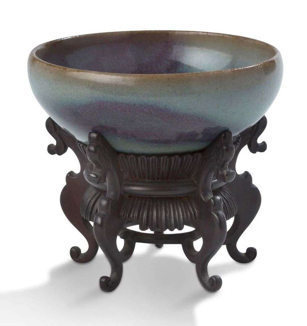 Petite coupe de type Junyao, avec très belle glaçure bleu lavande rehaussée de nombreux nuages pourpres. Avec socle en bois.