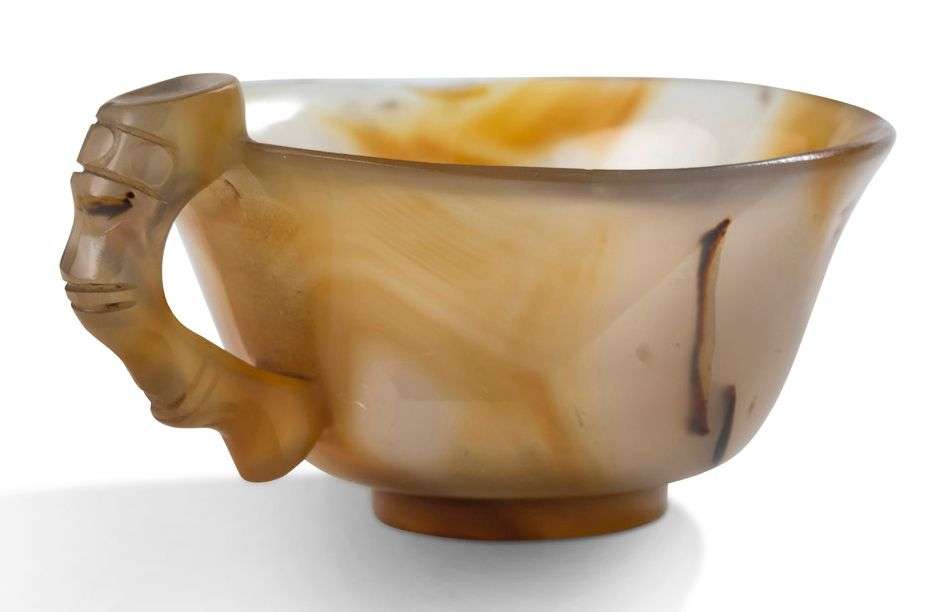 Coupe en agate grise infusée de brun et de beige, dont l'anse reprend la forme d'un bambou.