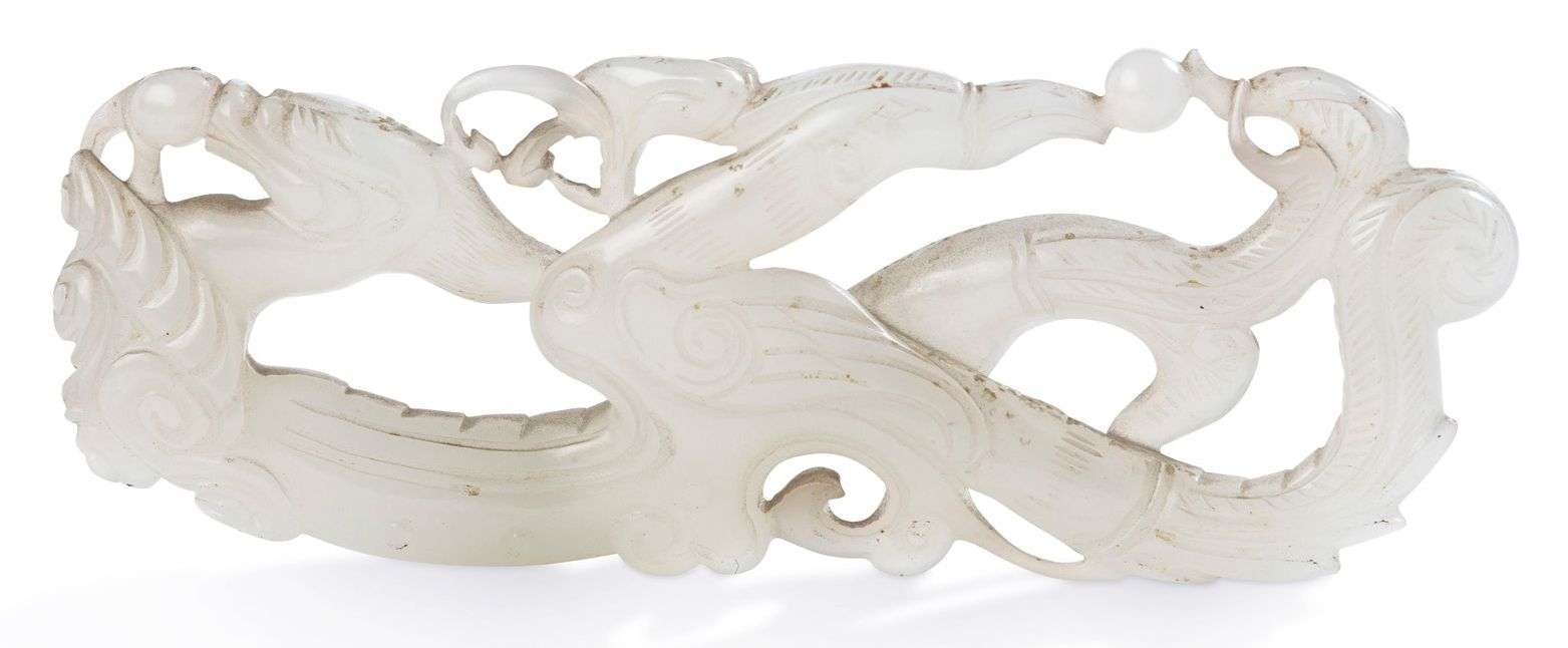 Pendentif en jade blanc, représentant un dragon et un phénix déroulés poursuivant le joyau sacré parmi des lingzhi.