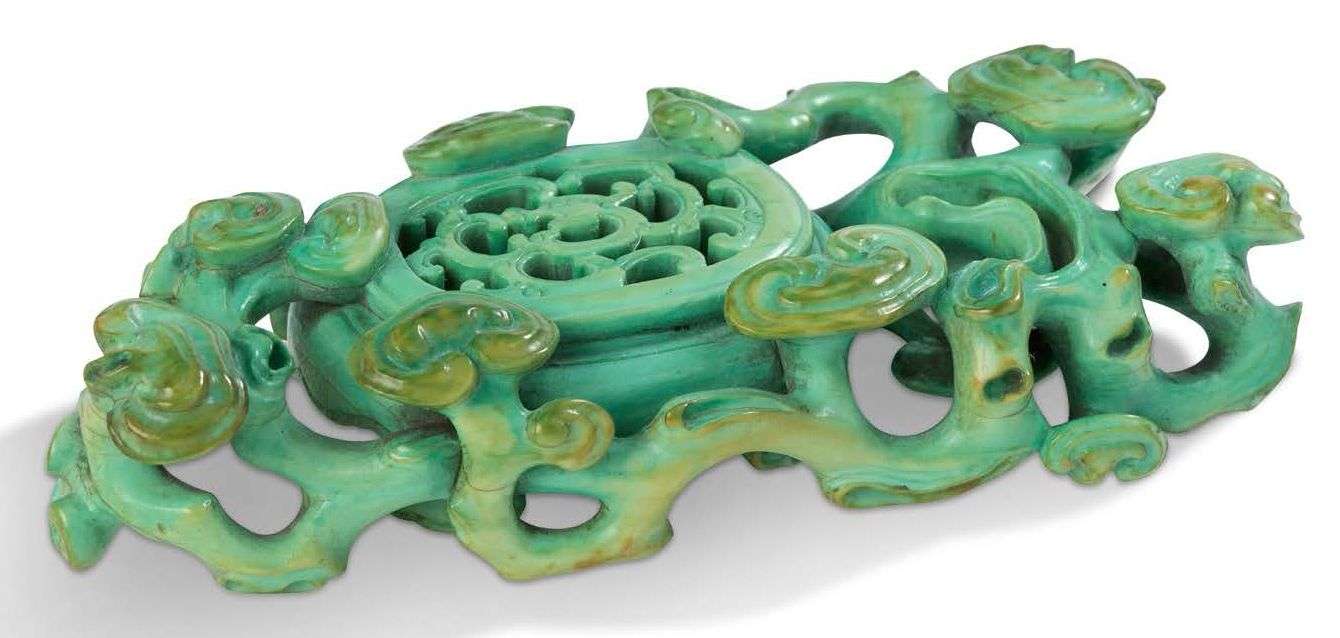 Petit socle en ivoire teinté à l'imitation de la turquoise, représentant un groupe de lingzhi autour d'un socle ajouré à motif de dragon.