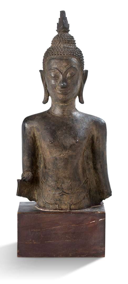 Buste de Bouddha en bronze, le visage aux yeux mi-clos, esquissant un sourire, exprimant la sérénité.