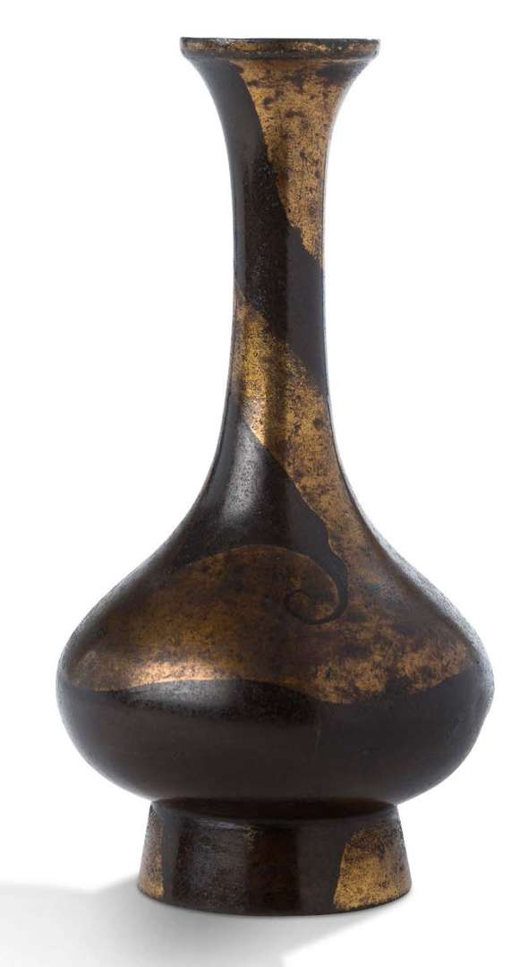 Petit vase pansu à long col légèrement évasé, en bronze de patine brune, à décor parsemé d'or de motifs de passementerie.