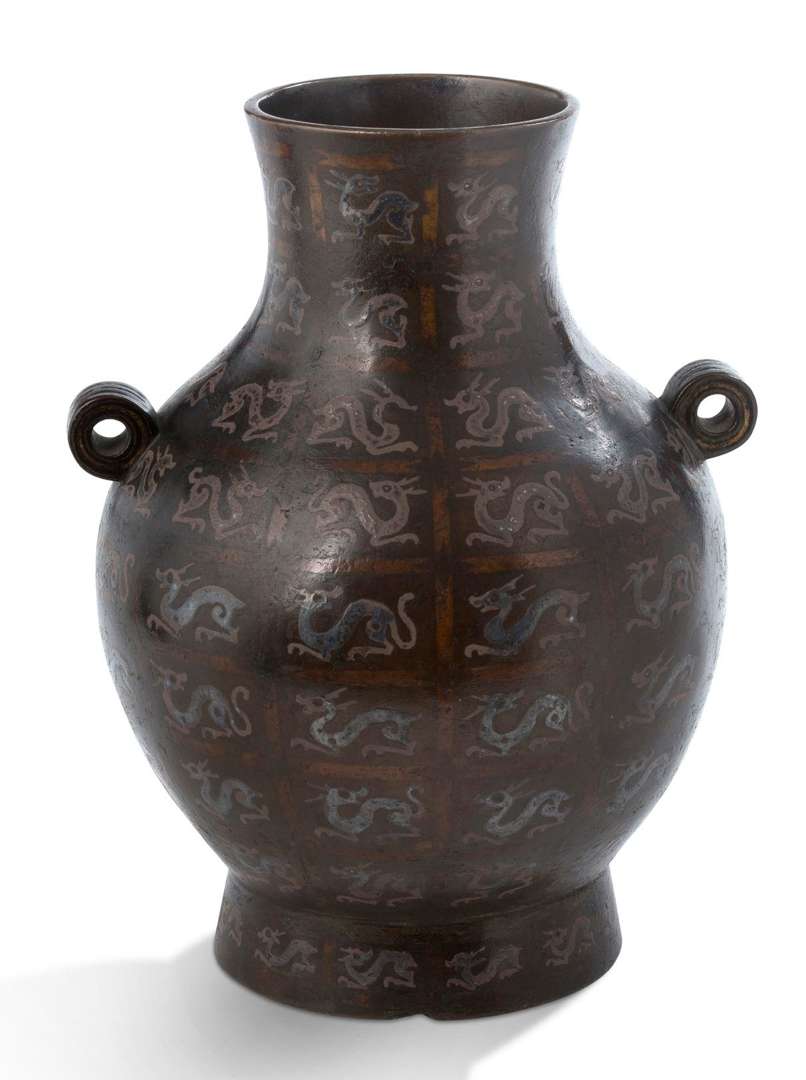 Vase de forme Hu en bronze de patine brun-clair, à décor en application d'argent de dragons de profil sur plusieurs registres dans des encadrements de patine brun-clair, la base du col ornée de deux petites anses tubulaires.