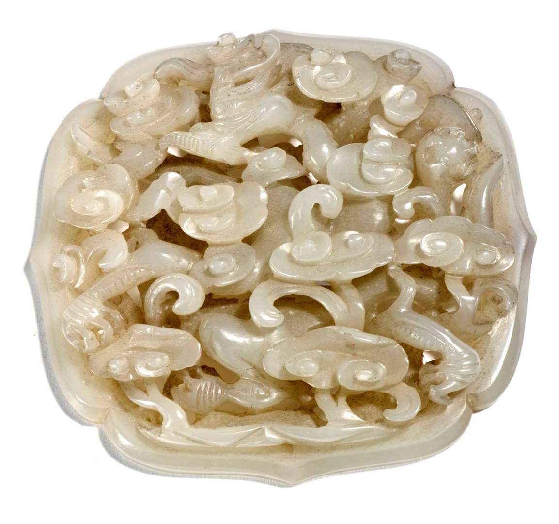 Plaque de sceptre ruyi en jade blanc, très finement décoré d'un dragon évoluant parmi une forêt de lingzhi. Le pourtour orné de quatre pétales de lotus stylisés.