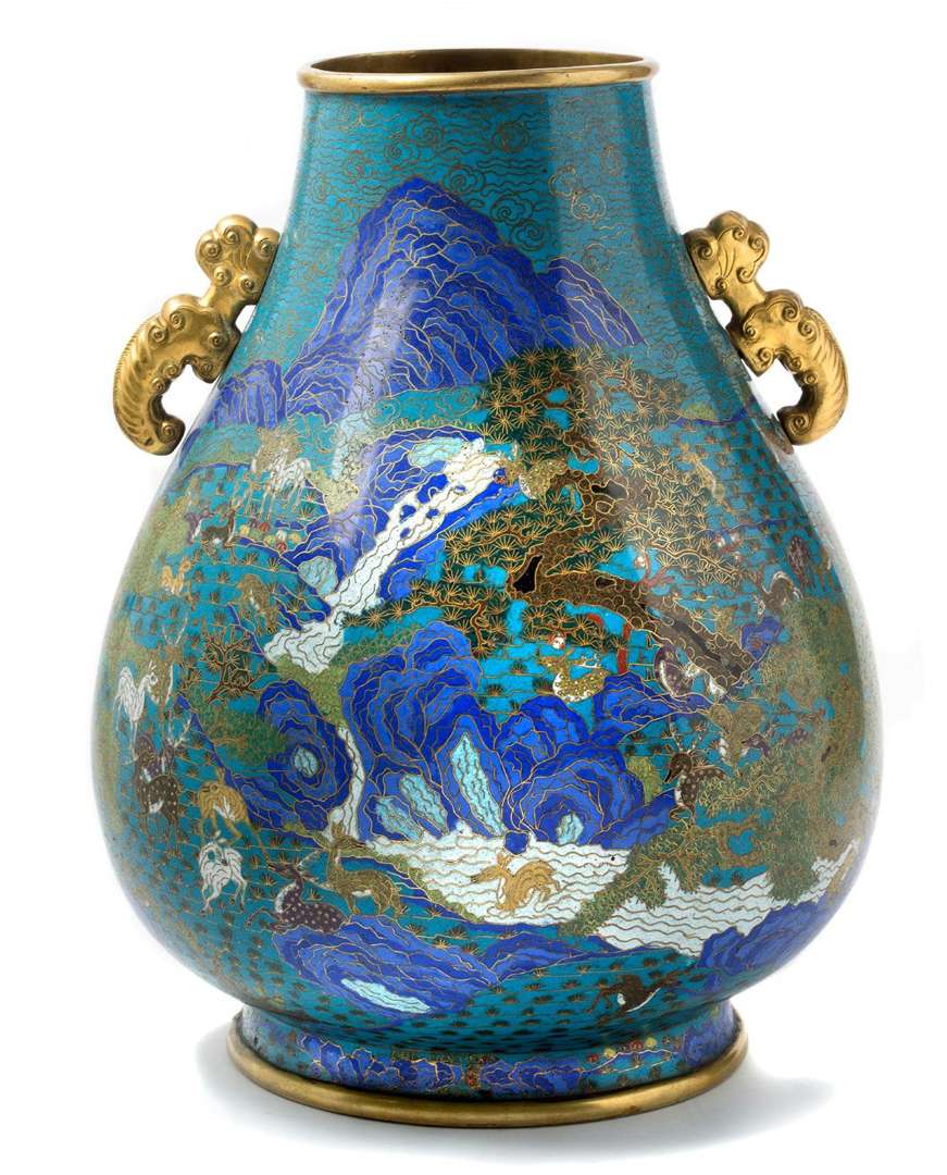 Exceptionnelle paire de grands vases de forme Hu, en bronze doré et émaux cloisonnés polychromes sur fond bleu-vert, à décor dit «aux cent daims», les cervidés évoluant dans des prairies, parmi rochers, pins et cascades sur fond de paysage de montagnes, le col rehaussé de deux anses en cuivre repoussé doré figurant des dragons stylisés, la base dorée.