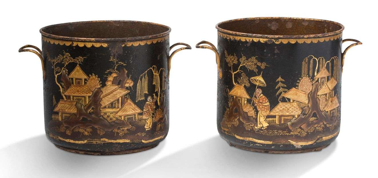 Paire de cache-pots en tôle laquée noir à décor laqué or d'un village champêtre
