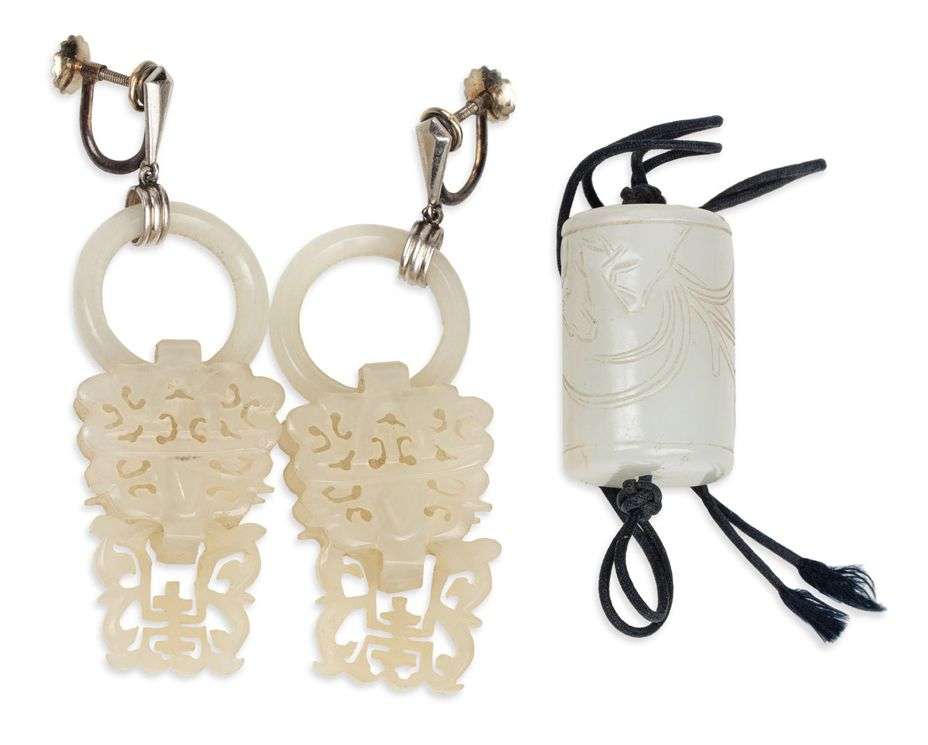 On y joint un pendentif cylindrique en jade blanc, à décor incisé d'un iris près d'un rocher, et caractères calligraphiés.