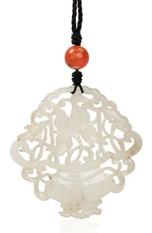 Pendentif en jade blanc sculpté et ajouré, finement ciselé d'une jardinière fleurie de lotus et lingzhi. Petite sphère de corail.