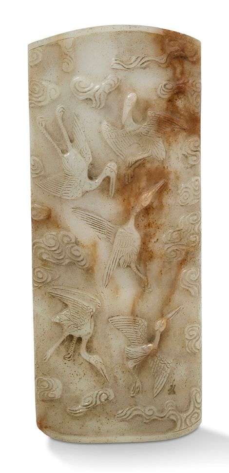 Objet de lettré en jade céladon partiellement infusé de rouille, à décor de grues évoluant parmi des nuages.