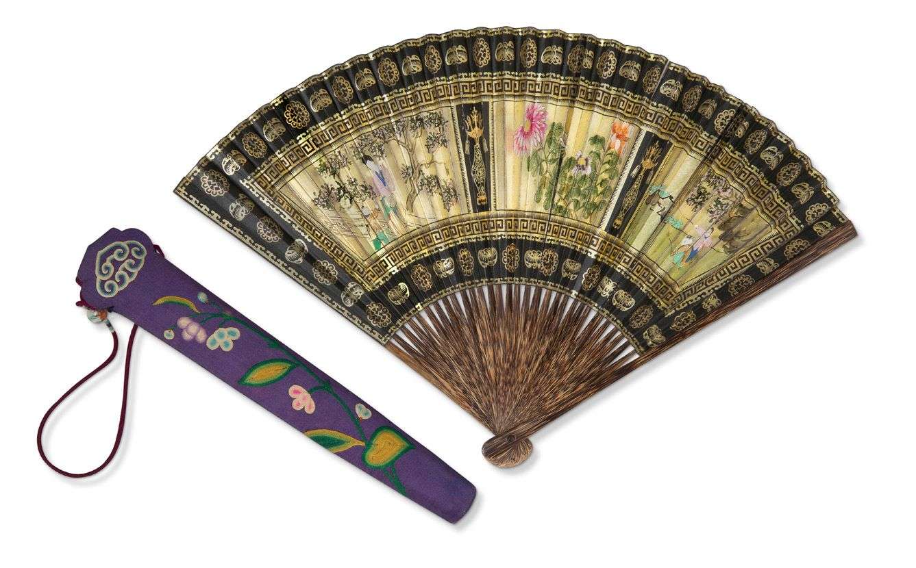 On y joint un éventail à décor de scènes de personnages, compositions florales, et objets mobiliers.