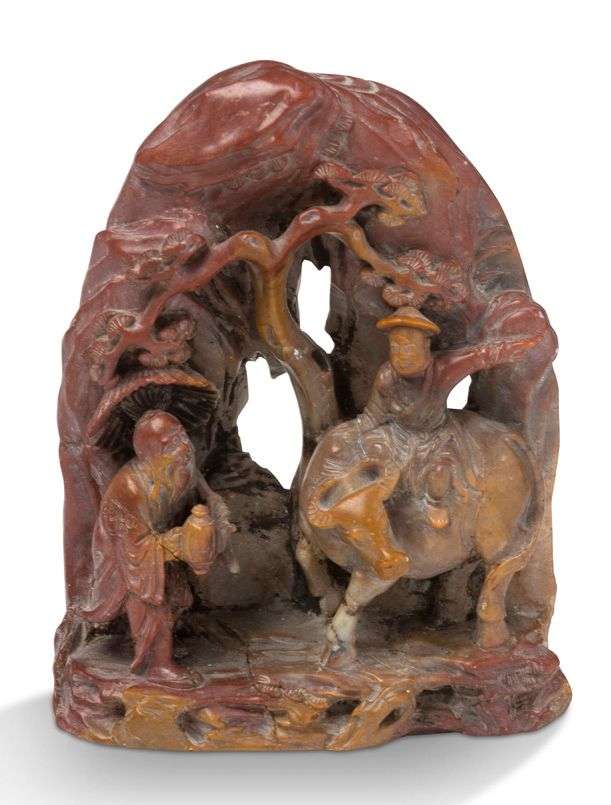 Groupe en stéatite shoushan beige et rouge, représentant un bouvier sur un buffle rencontrant un ermite tenant une verseuse, devant une grotte et un pin de longévité.