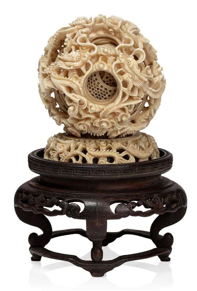 Boule de Canton en ivoire sculpté et ajouré de cinq dragons parmi des nuages stylisés, l'intérieur présentant une dizaine de sphères mobiles sculptées et ajourées, à décor de motifs géométriques. Sur un petit socle en ivoire sculpté et également ajouré de deux dragons.