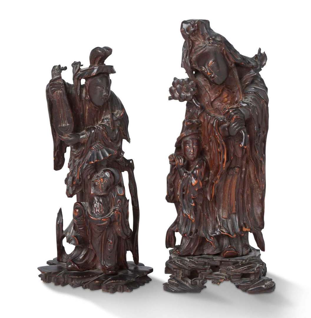 Deux statuettes en bois, finement sculptées et de belles patines, représentant une jeune femme tenant une fleur, accompagnée d'un enfant jouant de la flûte pour l'une| l'autre, une musicienne accompagnée d'un danseur à l'éventail.