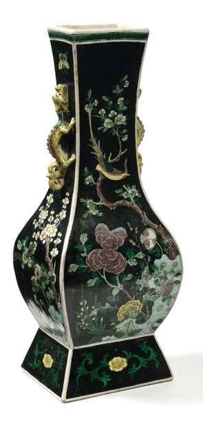 Vase de type fanghu à long col en porcelaine et émaux de la famille verte sur fond noir, les deux faces principales à décor de chrysanthèmes, prunus en fleurs sur lequel est perché un oiseau, et rochers| les deux autres faces ornées d'un prunus et de fleurs émergeant d'un rocher, le col rehaussé de deux anses en relief en forme de dragons. Marque apocryphe Kangxi sur la base.