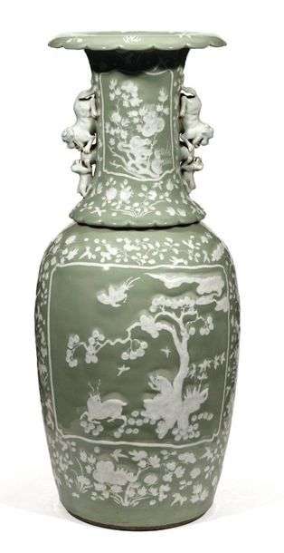 Grand vase balustre en porcelaine, à ouverture polylobée, à décor en barbotine blanche sur fond céladon d'un singe et un daim, et un couple de capridés auprès d'un pin dans deux grands panneaux, sur fond de motifs floraux et papillons, le col formant une collerette au niveau de l'épaule, à décor d'animaux et fleurs dans des réserves sur fond de fruits et fleurs, rehaussé d'anses en ronde-bosse figurant des chiens de Fô et leurs petits.