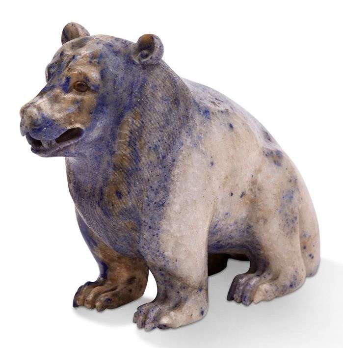 Sujet en lapis-lazuli veiné de gris, représentant un ours assis, les yeux incrustés de corne.