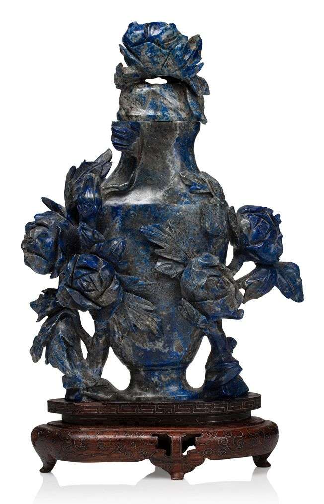 Vase balustre couvert en lapis-lazuli, sculpté de fleurs de pivoines.