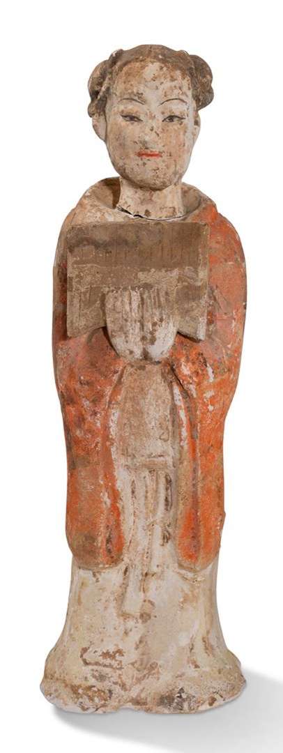 Statuette Mingqi en terre cuite argileuse et fine, polychrome blanche et ocre, moulée, avec des traces de polychromie rose et noire, représentant une musicienne en robe blanche et manteau rose aux longues manches, tenant à deux mains un paixiao, flûte de Pan antique à treize tuyaux.