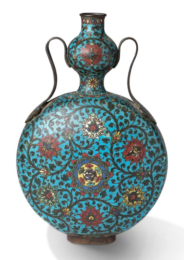 Vase Bien-Hu en cuivre et émaux cloisonnés à décor polychrome sur fond bleu de lotus et rinceaux feuillagés avec, de chaque côté, un phénix lové dans un médaillon central floriforme.
