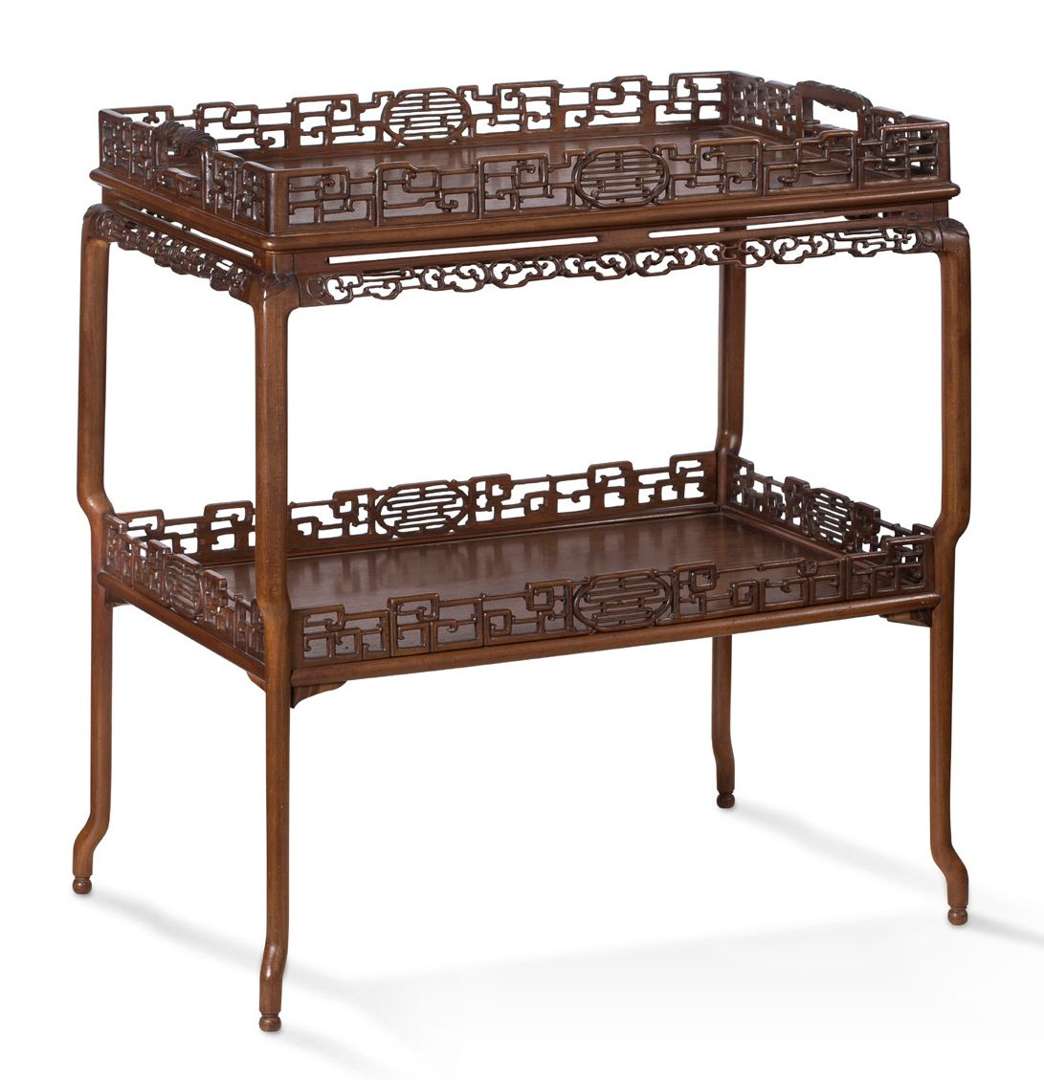 Table en bois, à deux plateaux, le plateau haut sculpté d'une frise géométrique stylisée en relief ajourée à décor de caractères shou, avec deux poignées ornées de chauve-souris| le plateau bas à décor de caractères shou sur chaque côté d'une frise sculptée stylisée.