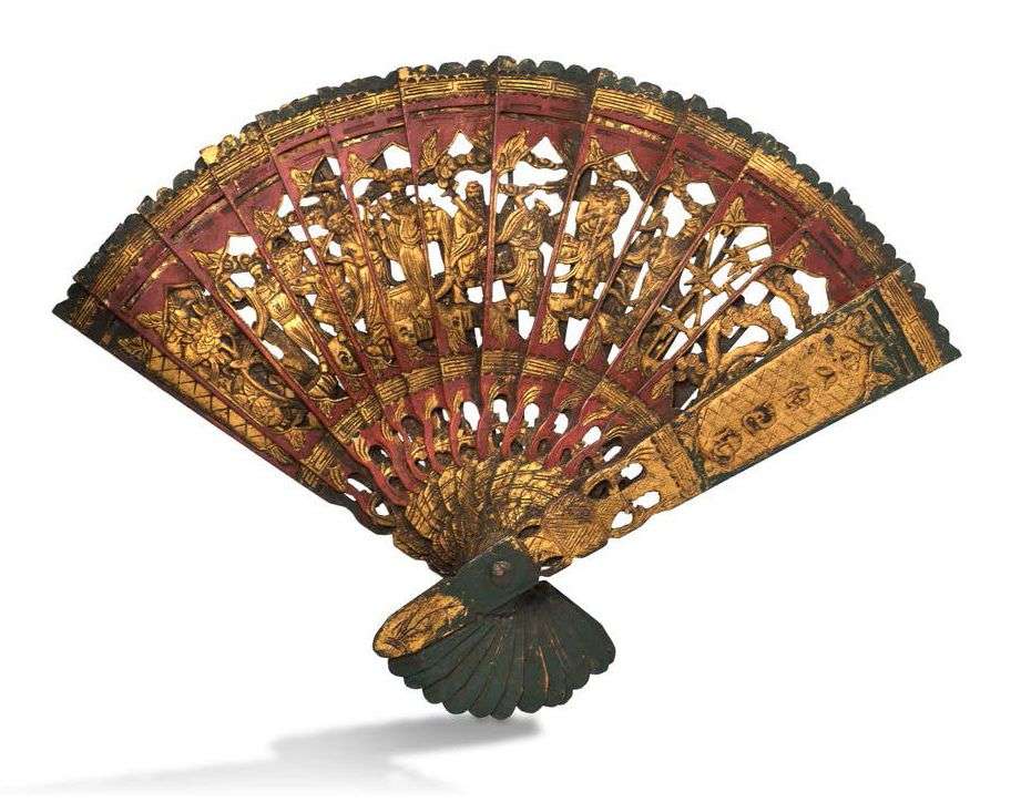 Lot comprenant un éventail et un petit paravent en bois de Ningbo, sculpté et ajouré, à décor laqué or avec de polychromie, représentant personnages et motifs floraux.