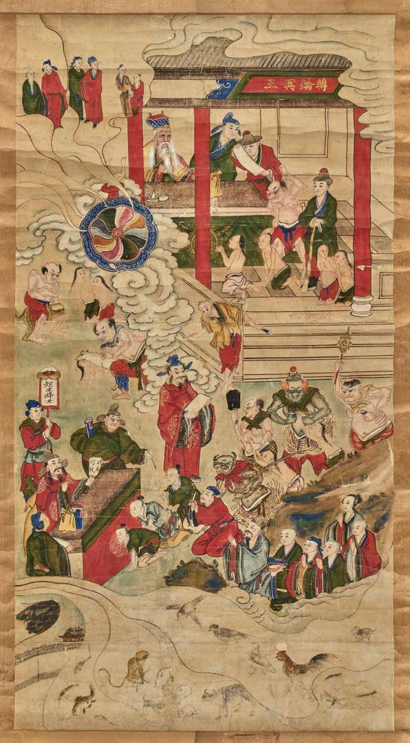 Peinture verticale en polychromie sur papier, représentant une scène de jugement taoïste.
