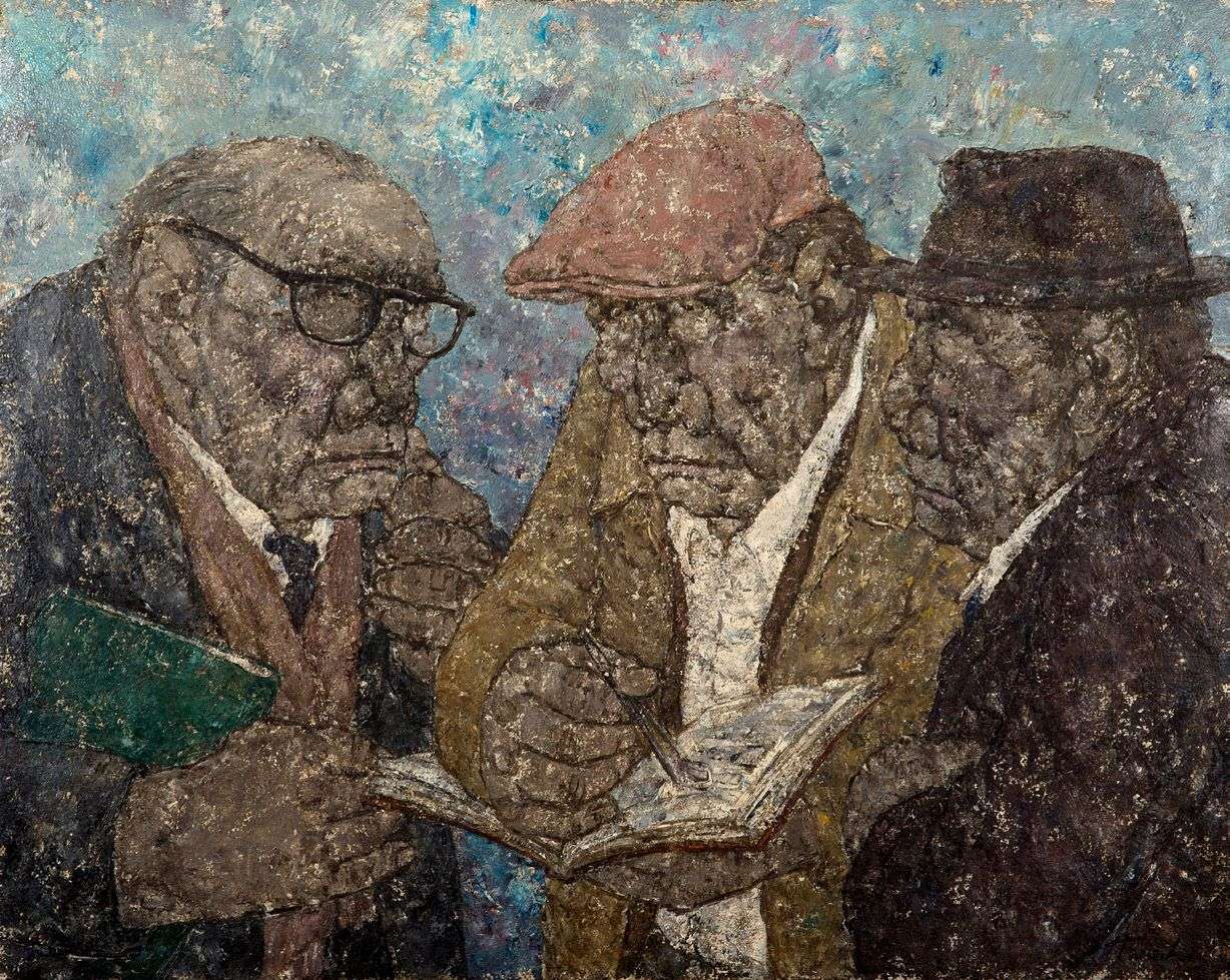 Variant souvent les formats, Tanaka reste en revanche fidèle à sa toile de lin grossière. Ses oeuvres sont parfois sombres mais aussi colorées et peuplées d'une foule hétéroclite. C'est notamment le cas du Marchand de timbres, de 1972, oeuvre colorée et présentant des amateurs au style très caractéristique de l'artiste. Cette oeuvre retranscrit parfaitement l'ambiance qui règne entre les philatélistes, la nostalgie qui peut émaner d'un marché aux timbres et enfin l'art très abouti de la couleur et de ses effets très visible dans les vêtements et les nuances du ciel de cette toile.