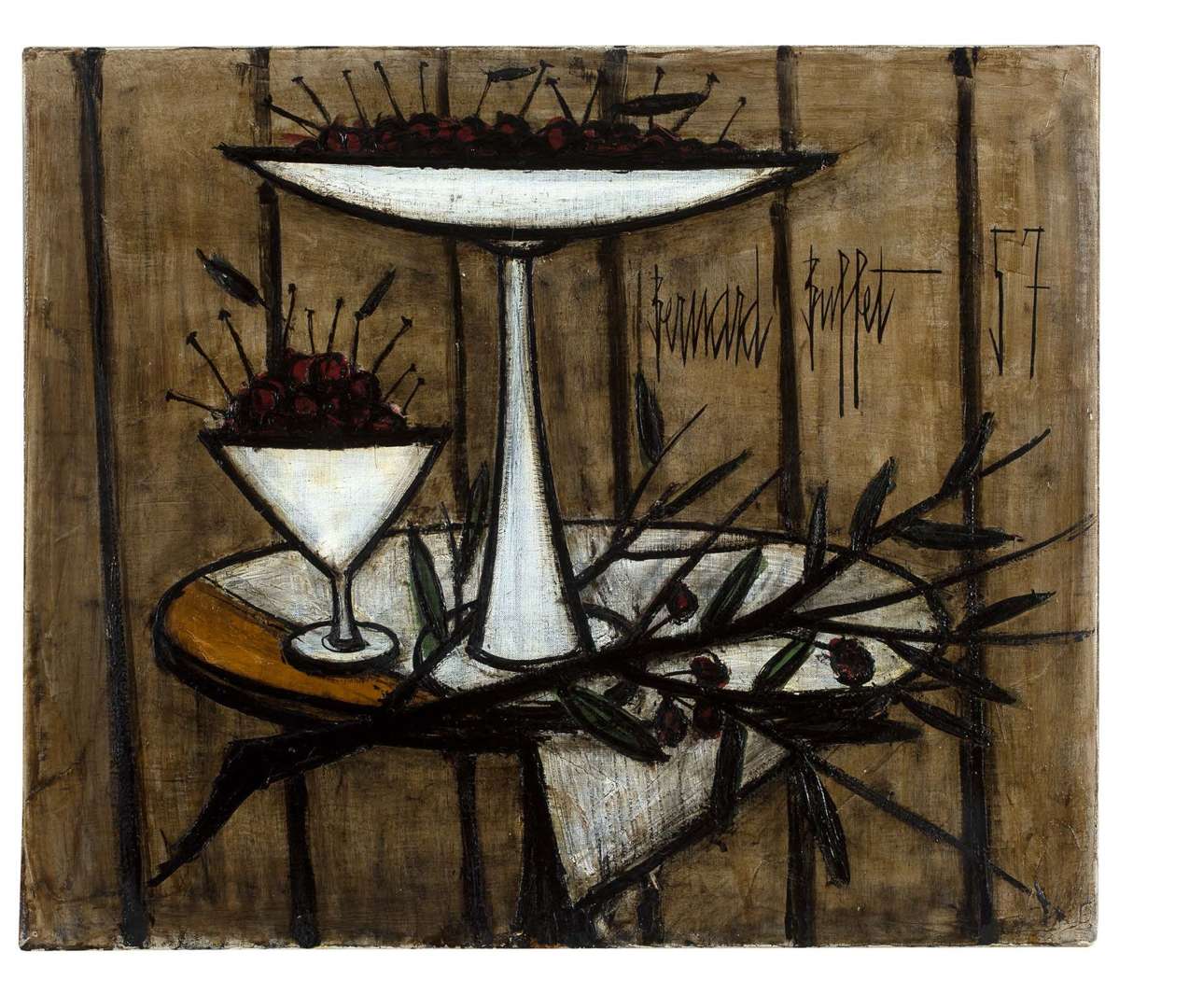 Toute sa vie durant, Bernard Buffet peindra des natures mortes. Elles viendront scander son OEuvre comme un leitmotiv, et on peut y retrouver un caractère intemporel par la nature même de ce genre. L'artiste présente en réalité un inventaire personnel des objets familiers qu'il peint chez lui : paniers à bouteilles, dessous de plats, et compotiers. Cerises dans un compotier peint en 1957 reprend les lignes acérées et les tons ocres si caractéristiques de la période d'après-guerre de Bernard Buffet. Le compotier, objet du quotidien, côtoie les cerises, fruits destinés à murir puis pourrir. L’immobilité du genre de la nature morte permet d’entamer une réflexion sur l’instant présent, sur la vie et la mort, thèmes chers à Bernard Buffet.