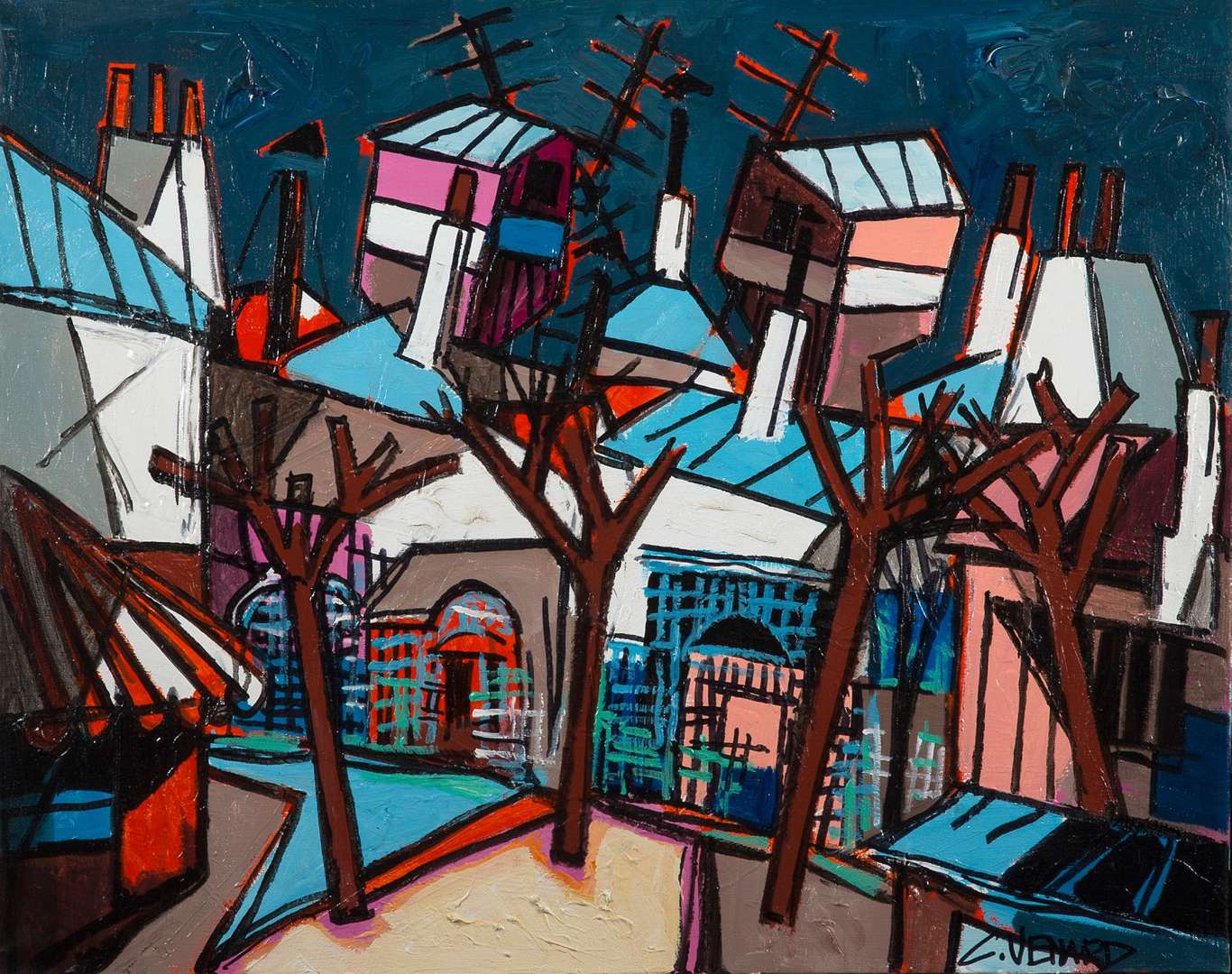 Claude Venard (1913-1999) est un peintre français autodidacte, qui forge son éducation artistique en restaurant des peintures au Musée du Louvre. À partir de 1935, il figure dans les expositions consacrées à l'Art moderne du monde entier. En 1936, il participe à une exposition en faveur d'un nouveau mouvement artistique dérivé de l'avant-garde, «Les forces nouvelles», prônant un retour aux principes stricts et traditionnels de l'artisanat, dont font partie les artistes Pierre Tal Coat et André Marchand. Mais Claude Venard finit par s'en détacher et développe alors un style personnel dans la veine du postcubisme. Il accentue les couleurs, appliquées de manière franche avec un couteau à palette, créant ainsi une matière «brute» au coeur d'une esthétique géométrique. Les couleurs y sont tranchantes, vives et lumineuses, d'autant plus mises en valeur par les contours et les ombres d'un noir absolu. Chaque couleur s'impose par la subtilité et l'éclat de sa teinte, aucune n'étouffant l'autre.