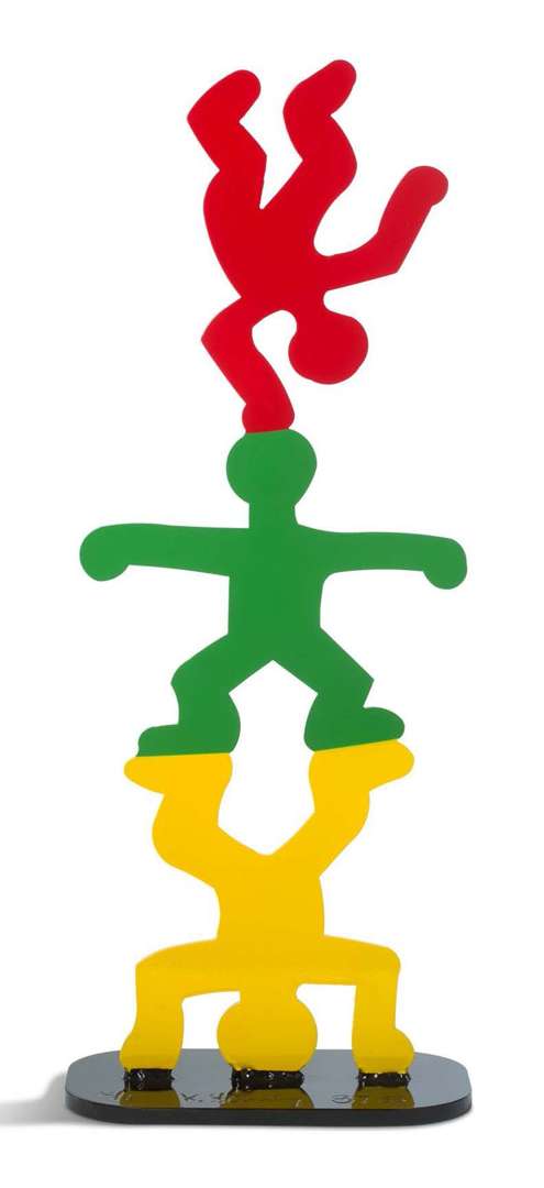 La sculpture que nous présentons, Totem d'acrobates de 1987, est typique de cette période de la carrière d'Haring. Sa notoriété grandissant sans cesse, il est sollicité pour des projets monumentaux et décline également son art en sculpture, dont certaines mesurent plusieurs mètres de haut et pèsent près d'une tonne. Sur cette pièce se retrouvent ainsi les traits caractéristiques de son travail : la ligne, la couleur, la silhouette. D'abord l'art de la ligne qui donne du volume et de la présence à une oeuvre qui reste résolument plate, comme dessinée sur un mur, exercice cher au coeur d'Haring. Vient ensuite son agencement des couleurs simples et entières, ici le vert, le rouge et le jaune, qui détachent l'ensemble de n'importe quel fond. Enfin, nous y retrouvons les silhouettes reconnaissables entre toutes qui auront joué un si grand rôle dans le succès d'Haring.