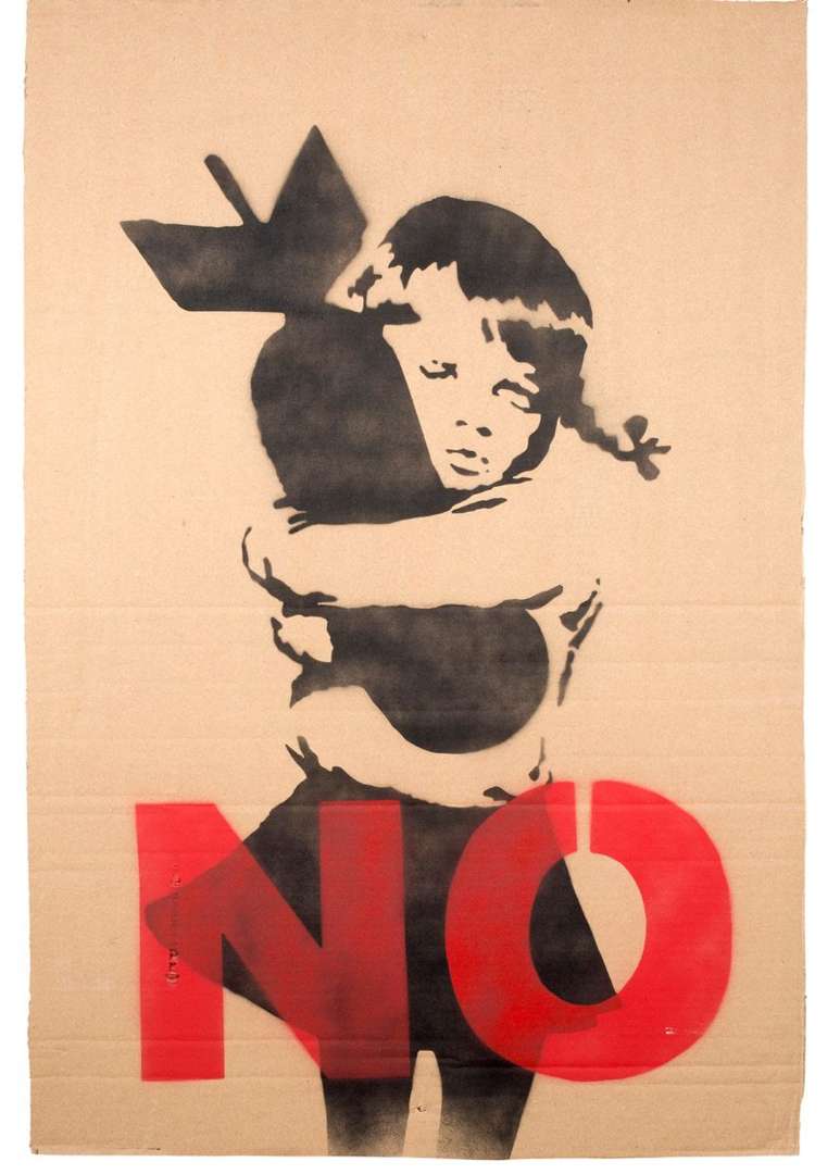 Aérosol sur carton, portant une étiquette Stop The War. Demonstrate Saturday 15 Feb. 2003 au dos