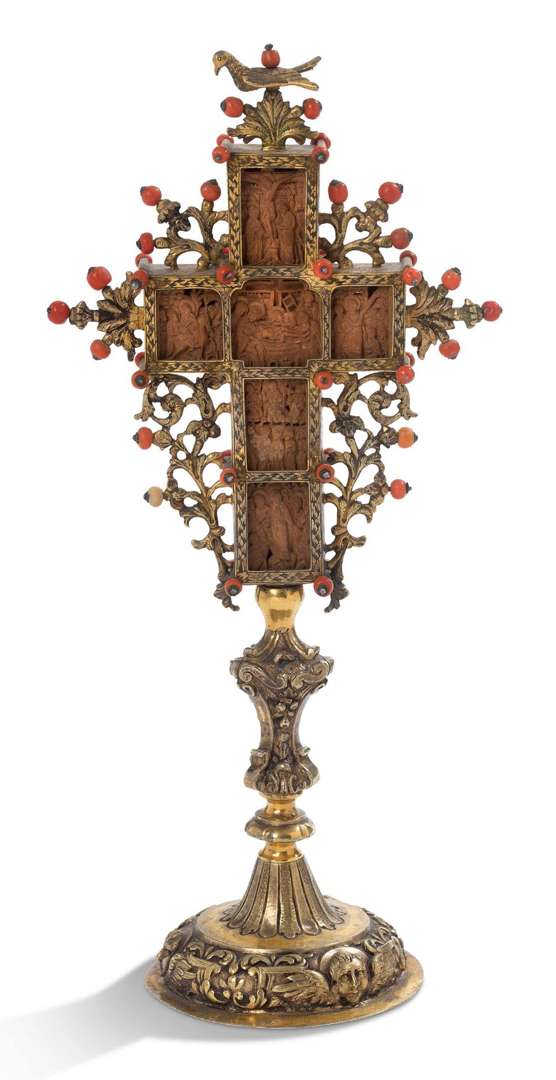CROIX en bois sculpté en bas-relief avec monture en argent doré et bronze doré avec perles de corail, rinceaux fleuris, base circulaire à décor de têtes de putti, fût en balustre. Sur une face sont représentées : L'Annonciation, La Nativité, La Présentation au Temple, la Transfiguration, le Baptême, la Dormition de la Vierge | et sur l'autre face : l'Entrée à Jérusalem, la Déploration, la Résurrection de Lazare, la Crucifixion, la Pentecôte, la Descente aux Limbes | poinçons. Croix : Mont Athos, XVIIe siècle Monture : Italie du Sud, XVIIIe siècle