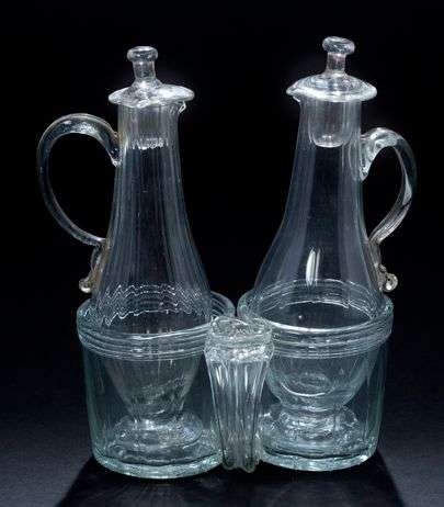 Porte huilier-vinaigrier en verre soufflé, anse en applique avec appui-main | deux flacons en verre de forme balustre et côtelée, anse en applique, bouchon.