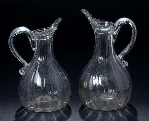 Deux pichets à cidre en verre claire soufflé, de forme pansue et côtelée, grand bec relevé, anse en applique.
