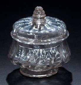 Petit confiturier en verre soufflé et moulé, panse renflée à pans à décor côtelé, couvercle avec prises de préhension en serpentin torsadé.