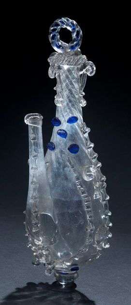 Baromètre à eau en verre soufflé et à décor appliqué de filets festonnés et de verres bleus | anneau de suspension torsadé.